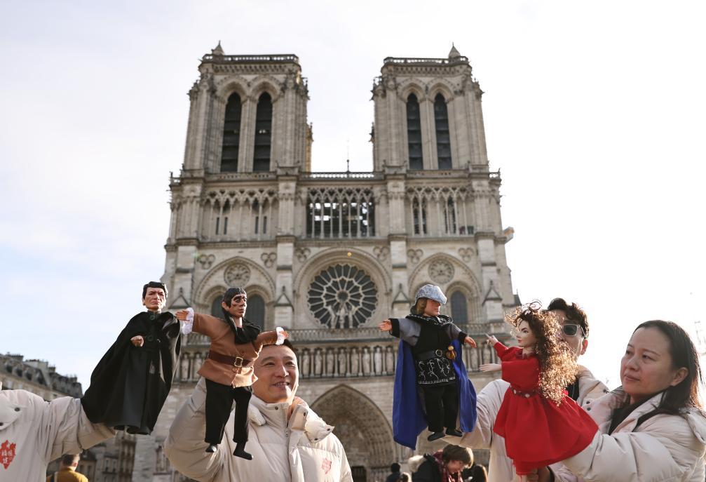 12月15日,在法國巴黎圣母院前,來自中國福建展演團(tuán)的演員表演布袋木偶戲《巴黎圣母院》。(新華社記者 高靜攝)