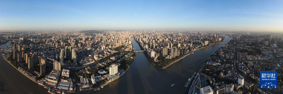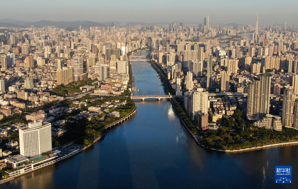 廣州市區(qū)沐浴在夕陽余暉之中(2024年11月29日攝,無人機照片)。