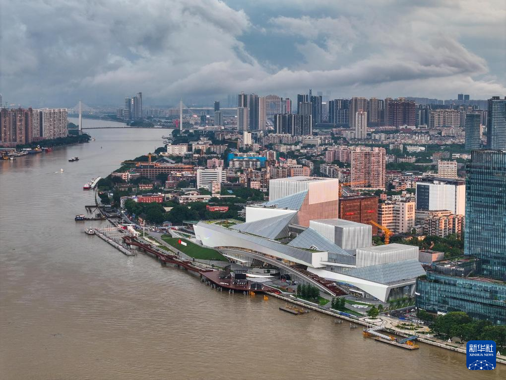 白鵝潭大灣區(qū)藝術中心宛如“文化巨輪”揚帆珠江(2024年4月27日攝,無人機照片)。