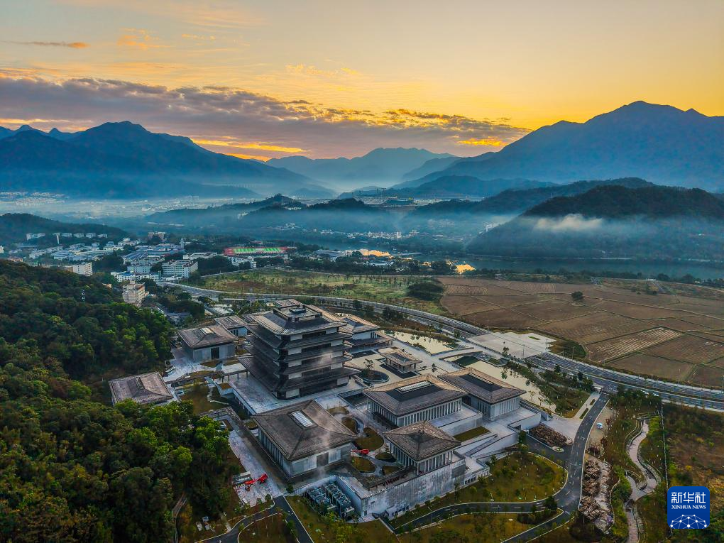 沐浴在晨曦中的廣州國家版本館(2024年12月3日攝,無人機照片)。