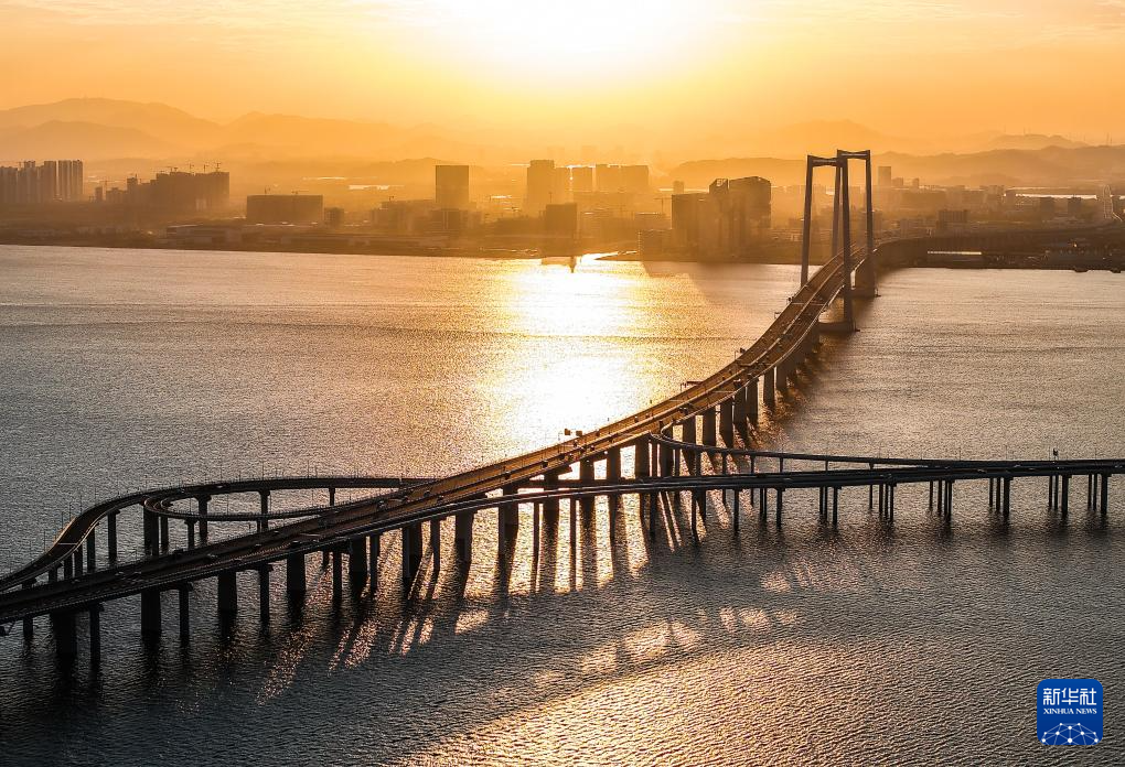 這是晨曦中的港珠澳大橋(2023年12月15日攝,無人機照片)。