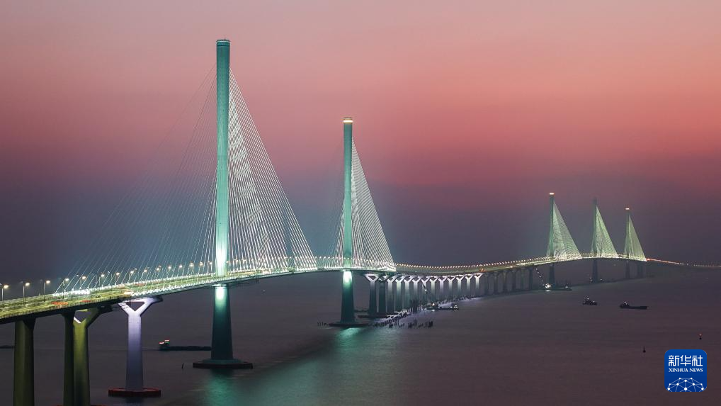 暮色中的黃茅??绾Mǖ栏邫诟鄞髽颍ㄗ髠入p主塔)和黃茅海大橋(右側三主塔)(2024年12月7日攝,無人機照片)。