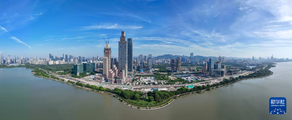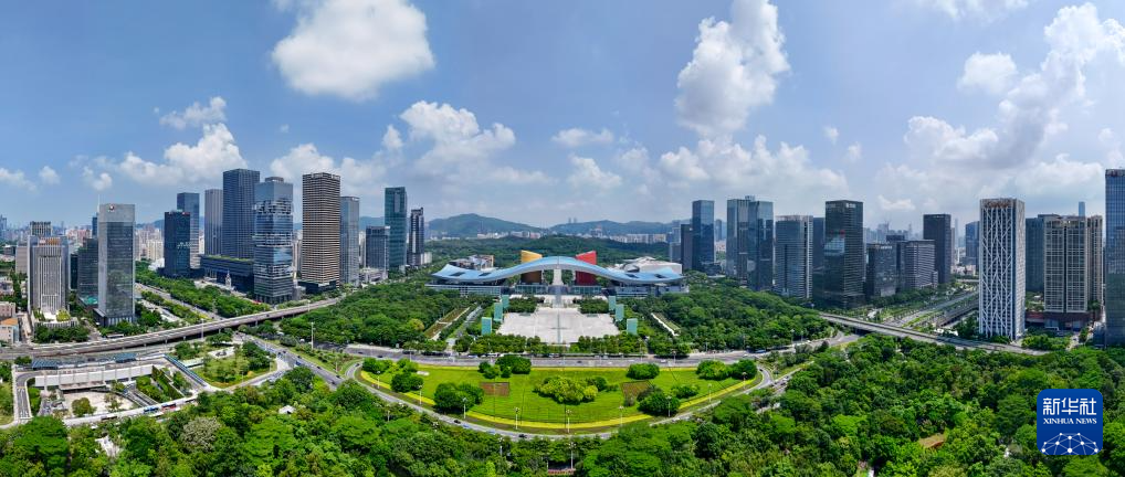 這是貫穿深圳福田CBD、市民中心、蓮花山公園的深圳中軸線(2024年8月27日攝,無人機全景照片)。