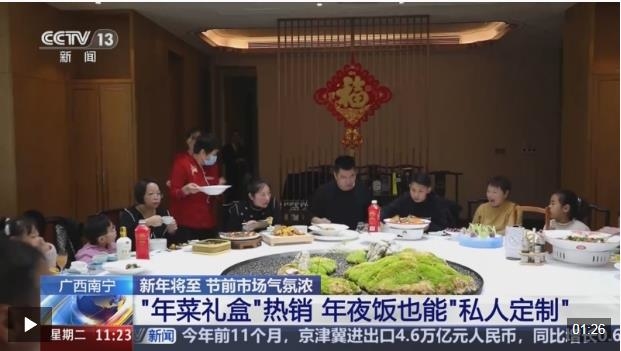 在廣西南寧,很多餐廳都開始了“年夜飯預(yù)訂”,并且在線上推出了“年菜禮盒”“年夜飯外賣大禮包”多款套餐,菜品特色主要以南寧本地菜為主,商家還能根據(jù)顧客的“私人定制”,對(duì)年夜飯?zhí)撞偷牟似愤M(jìn)行調(diào)整。