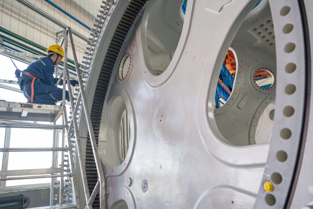 工人在位于黑龍江省齊齊哈爾市的中國一重集團有限公司風(fēng)電設(shè)備裝配車間加工風(fēng)電輪轂(4月28日攝)。新華社記者 謝劍飛 攝