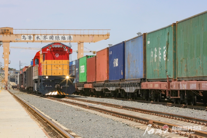 7月9日,一列新疆“天山號(hào)”多式聯(lián)運(yùn)品牌班列駛出烏魯木齊國(guó)際陸港區(qū)。石榴云/新疆日?qǐng)?bào)記者蔡增樂 攝