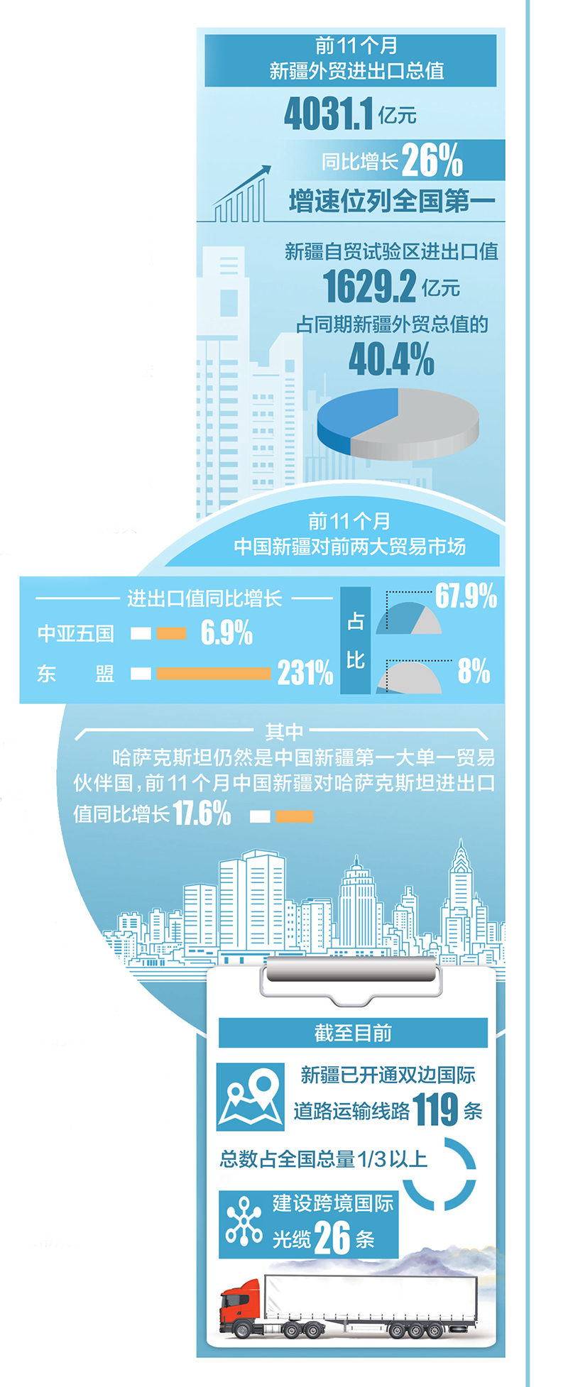 新疆自貿(mào)試驗區(qū)賦能效應(yīng)持續(xù)顯現(xiàn)。烏魯木齊海關(guān)數(shù)據(jù)顯示,前11個月,新疆自貿(mào)試驗區(qū)進出口值1629.2億元,占同期新疆外貿(mào)總值的40.4%。