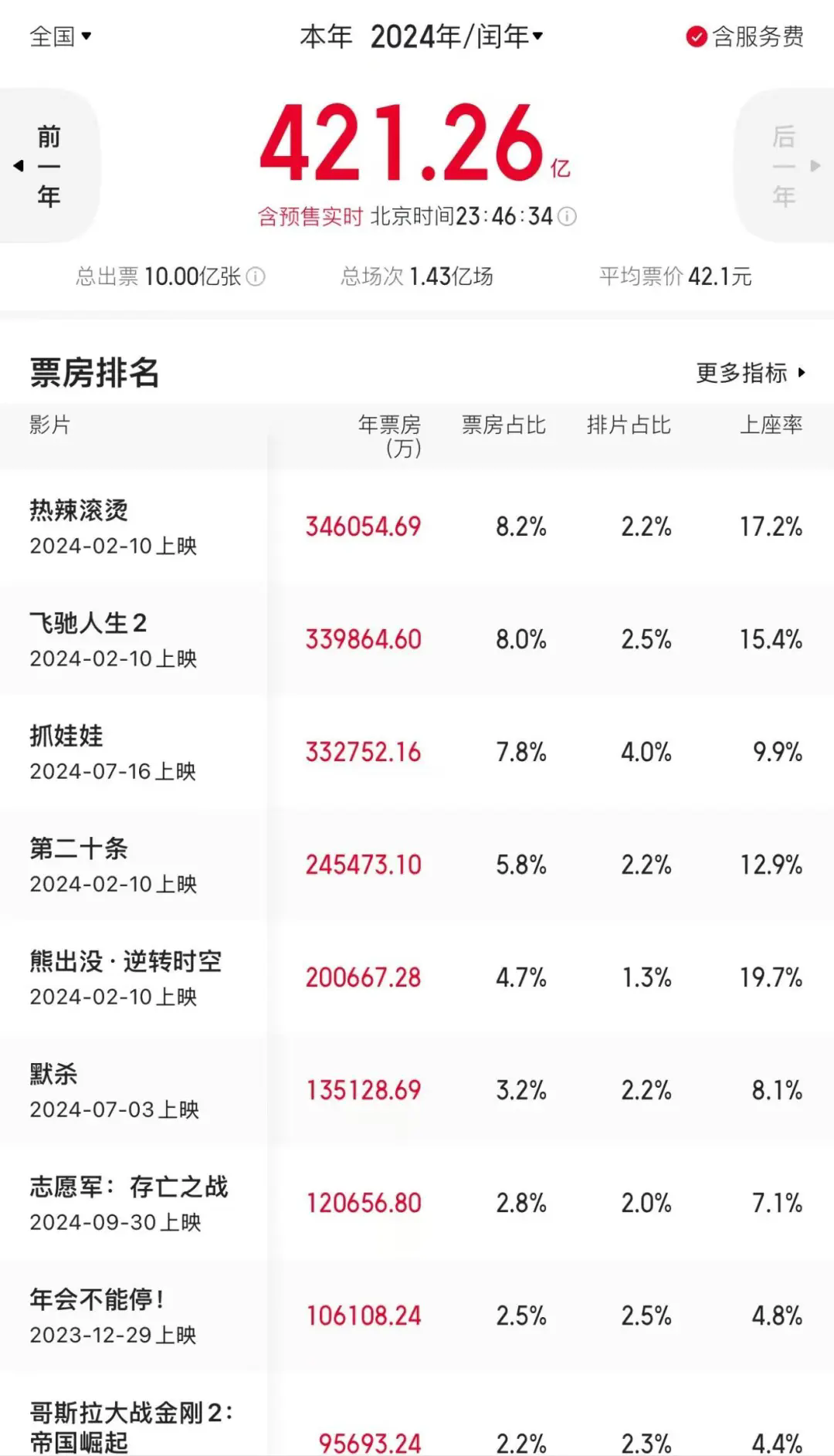 總場次1.43億場,平均票價42.1元
