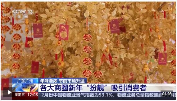在廣州各大商圈,歡喜過大年的喜慶裝扮陸續(xù)煥新,有的擺上紅紅火火的“金錢樹”,有的在商場內(nèi)設(shè)立各種展覽,增加消費(fèi)者購物樂趣和文化體驗(yàn)?! ?
