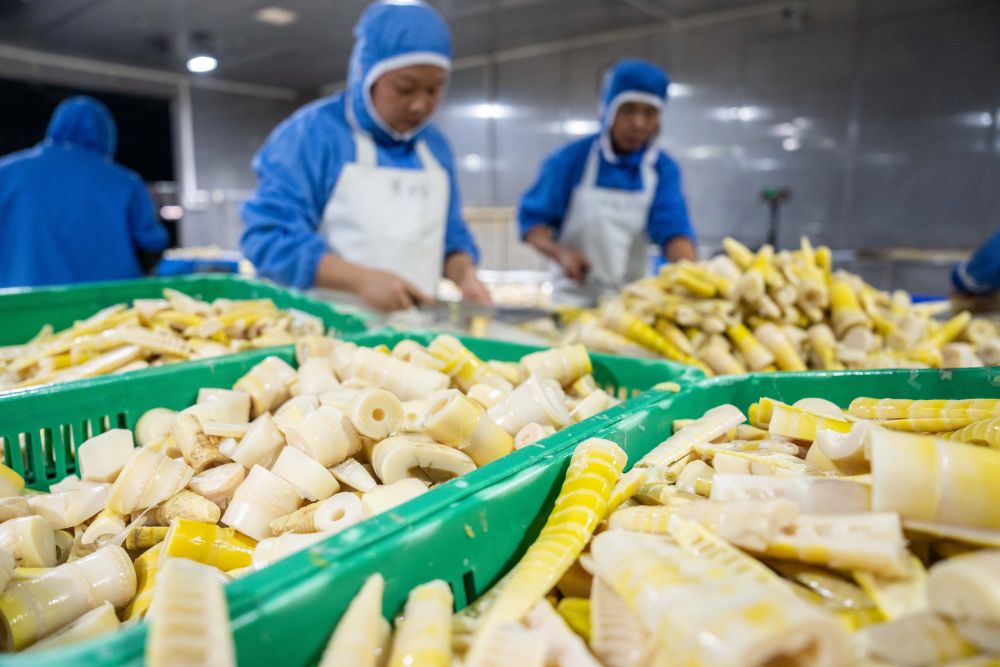 2024年11月27日,工人在湖南省益陽市桃江縣馬跡塘鎮(zhèn)筍竹特色產(chǎn)業(yè)園內(nèi)一家鮮筍加工企業(yè)生產(chǎn)車間加工鮮筍。竹筍產(chǎn)業(yè)是桃江縣的傳統(tǒng)特色產(chǎn)業(yè),當(dāng)?shù)匾劳胸S富的竹林資源,積極發(fā)展竹筍深加工產(chǎn)業(yè)。新華社記者 陳思汗 攝