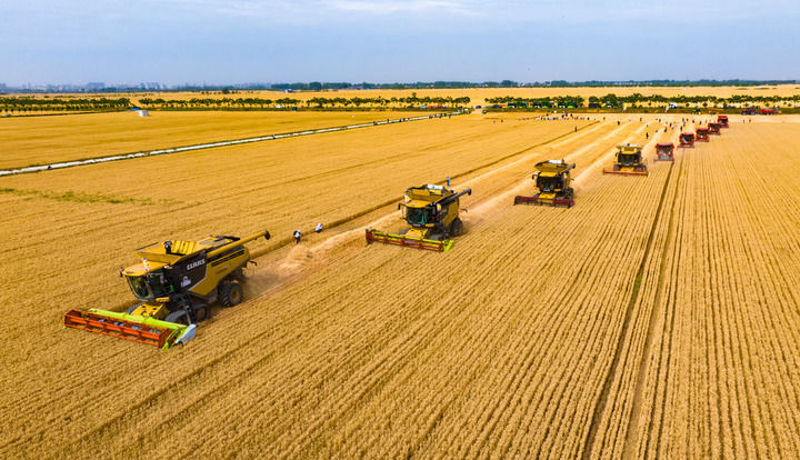 2024年5月29日,在河南省駐馬店市西平縣老王坡高標(biāo)準(zhǔn)農(nóng)田,機(jī)收編隊(duì)在收獲小麥。新華社發(fā)(趙永濤 攝)