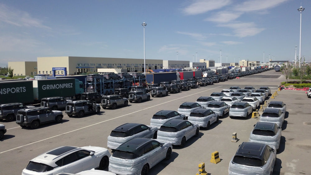 7月11日,在新疆霍爾果斯公路口岸,出口車(chē)輛排隊(duì)等待查驗(yàn)出關(guān)(無(wú)人機(jī)照片)。作為全國(guó)最大的汽車(chē)出口陸路口岸——霍爾果斯口岸今年汽車(chē)整車(chē)出口數(shù)量迅猛增長(zhǎng)。
