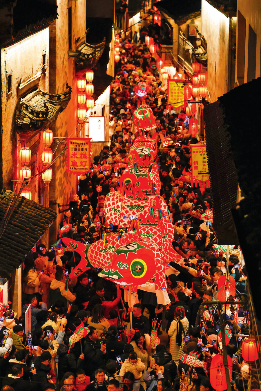在安徽省黃山市歙縣北岸鎮(zhèn)瞻淇村,村民舞動非遺魚燈,吸引了眾多游客(2024 年 12 月 31 日攝) 施亞磊攝 / 本刊