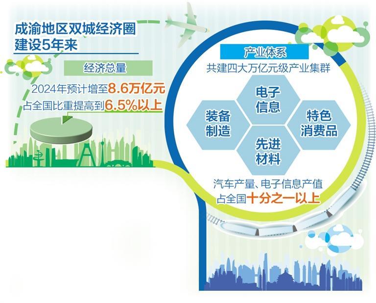 一是具有全國(guó)影響力的重要經(jīng)濟(jì)中心建設(shè)實(shí)現(xiàn)新躍升。經(jīng)濟(jì)總量上,雙城經(jīng)濟(jì)圈地區(qū)生產(chǎn)總值5年邁上了兩個(gè)萬(wàn)億元級(jí)臺(tái)階,2024年預(yù)計(jì)增至8.6萬(wàn)億元,占全國(guó)的比重由6.3%提高到6.5%以上;產(chǎn)業(yè)體系上,兩地共建電子信息、裝備制造、先進(jìn)材料、特色消費(fèi)品四大萬(wàn)億元級(jí)的產(chǎn)業(yè)集群,汽車(chē)產(chǎn)量、電子信息產(chǎn)值占全國(guó)十分之一以上。