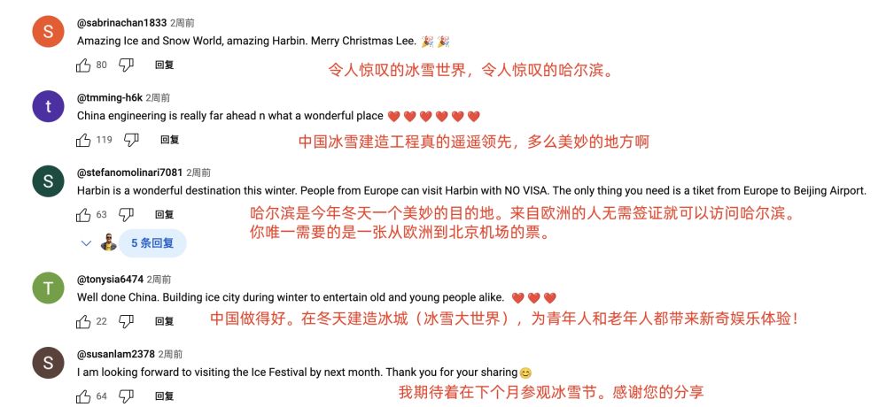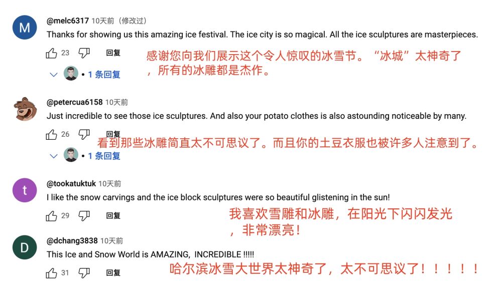 眾多海外博主仿佛找到了“流量密碼”,那就是發(fā)布來哈爾濱旅行Vlog,上傳和冰雕的打卡美照,評(píng)論區(qū)互動(dòng)好評(píng)如潮。
