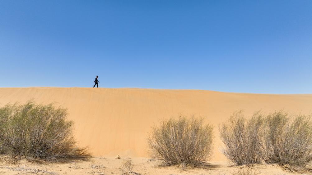 家住庫(kù)布其沙漠深處的烏日更,童年記憶里只有一種顏色?!凹依镌钆_(tái)、柜上有擦不完的黃沙,出門就是沙梁?!睘跞崭貞浾f,家鄉(xiāng)有個(gè)民謠唱道,“沙里人苦,沙里人累,滿天風(fēng)沙無植被……”
