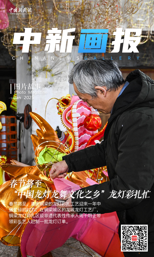 重慶銅梁區(qū)被譽(yù)為“中國(guó)龍燈龍舞文化之鄉(xiāng)”,銅梁龍燈彩扎是當(dāng)?shù)匾环N以龍文化為主題的燈彩藝術(shù)。2021年,銅梁龍燈彩扎被列入國(guó)家級(jí)非物質(zhì)文化遺產(chǎn)代表性項(xiàng)目名錄。銅梁龍燈彩扎以竹子和鐵絲為骨架,經(jīng)過扎制、裱糊、彩繪、整裝等繁復(fù)工序,最終呈現(xiàn)出栩栩如生的龍燈形態(tài)。春節(jié)將至,重慶銅梁的龍燈彩扎工藝迎來一年中最忙碌的時(shí)節(jié)。在銅梁城區(qū)的龍城龍燈工藝廠,銅梁龍燈彩扎區(qū)級(jí)非遺代表性傳承人周千明正帶領(lǐng)彩扎藝人趕制一批龍燈訂單。“由于龍燈彩扎依然保留傳統(tǒng)的手工制作技藝,一條長(zhǎng)約30米的龍燈,需要五名彩扎藝人花費(fèi)近一周的時(shí)間才能完成?!敝芮鞅硎?,每一條龍燈不僅是一件藝術(shù)品,更是一種文化的象征,其承載了傳統(tǒng)工藝的傳承與發(fā)展。圖為1月14日,周千明在裱糊龍頭。