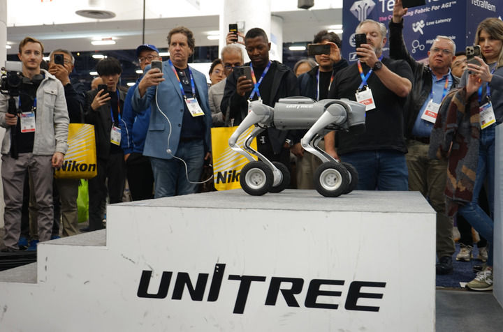 2025年1月8日,在2025年美國(guó)拉斯維加斯消費(fèi)電子展(CES)上,人們?cè)谥袊?guó)企業(yè)宇樹科技的展區(qū)觀看機(jī)器狗展示。新華社發(fā)(曾慧攝)