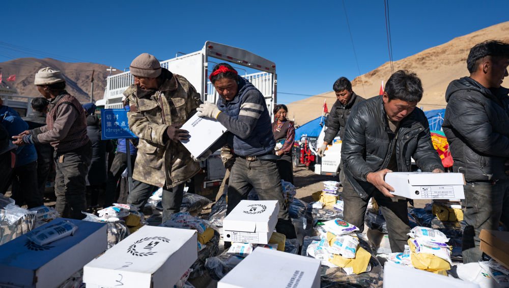 1月10日,在定結縣郭加鄉(xiāng)切村安置點,群眾分配救災物資。(新華社記者 丁增尼達 攝)