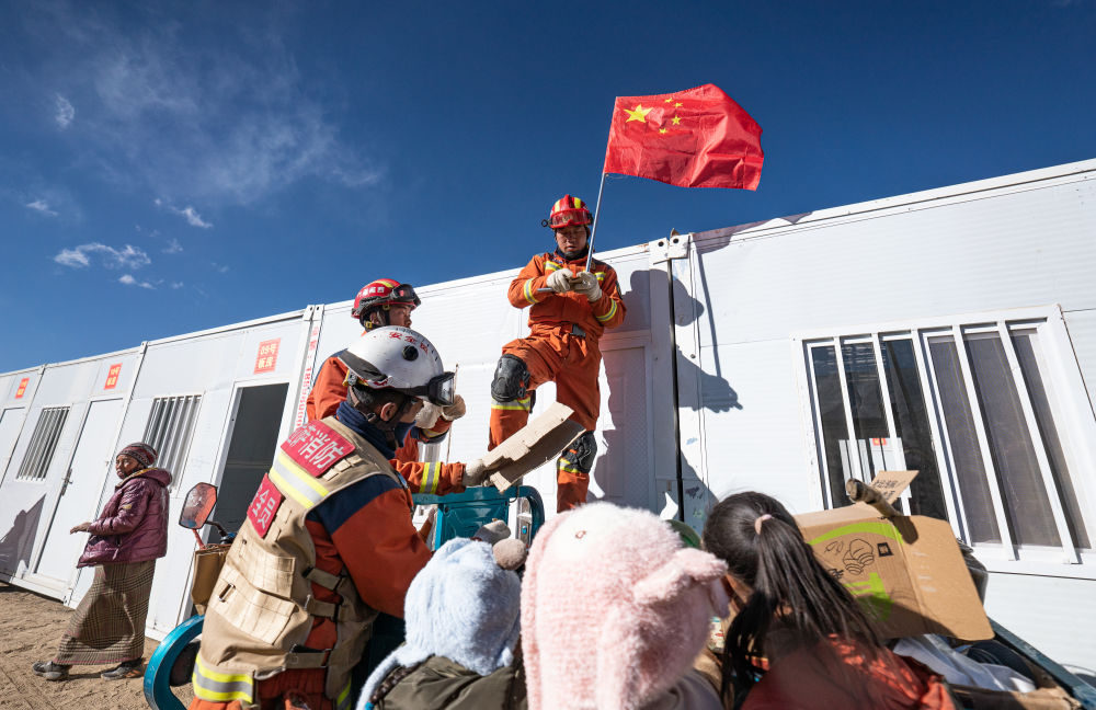 在定日縣措果鄉(xiāng)野江村,消防員在活動板房上安置國旗(1月13日攝)。(新華社記者 丁增尼達 攝)