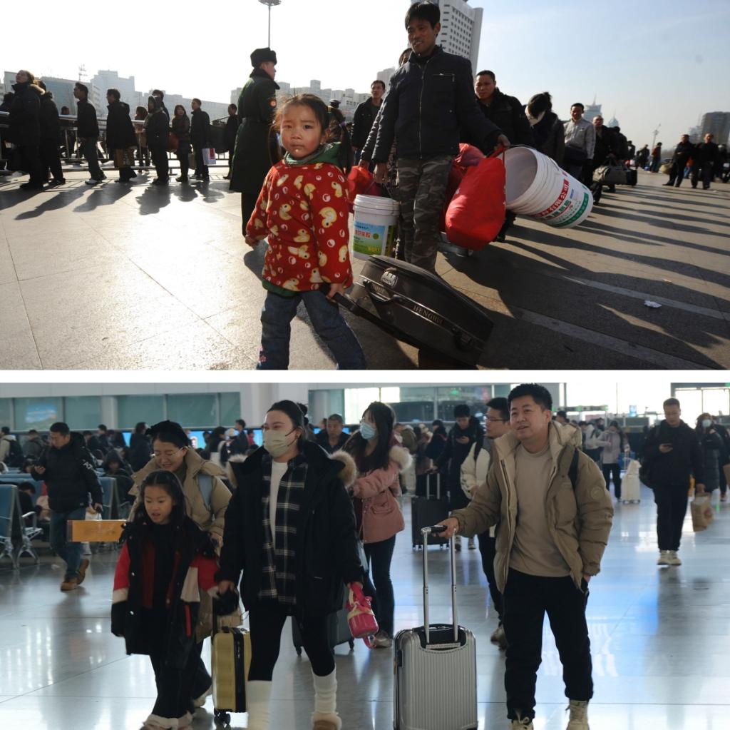 拼版照片。上圖為:2011年1月25日,在太原火車站,來自安徽的小女孩鐘媛媛和父母一起回家(新華社記者燕雁攝);下圖為:2025年1月18日,在太原南站,旅客踏上回家路(新華社記者王學(xué)濤攝)。新華社發(fā)