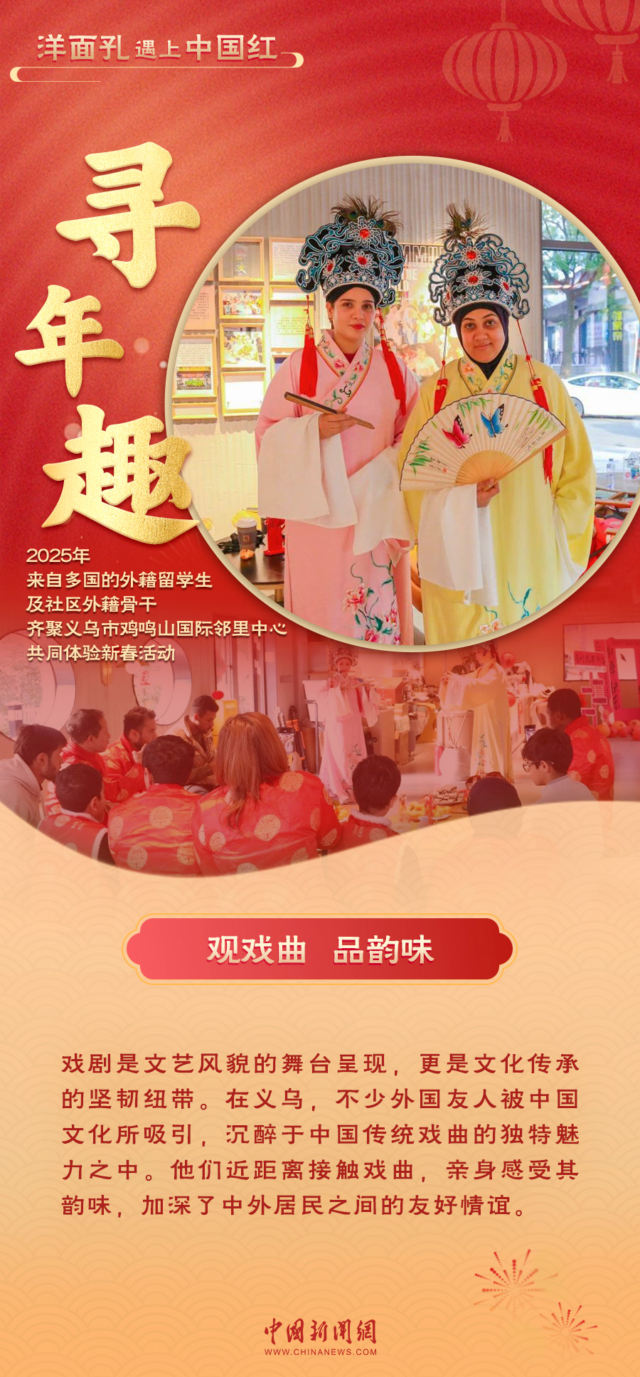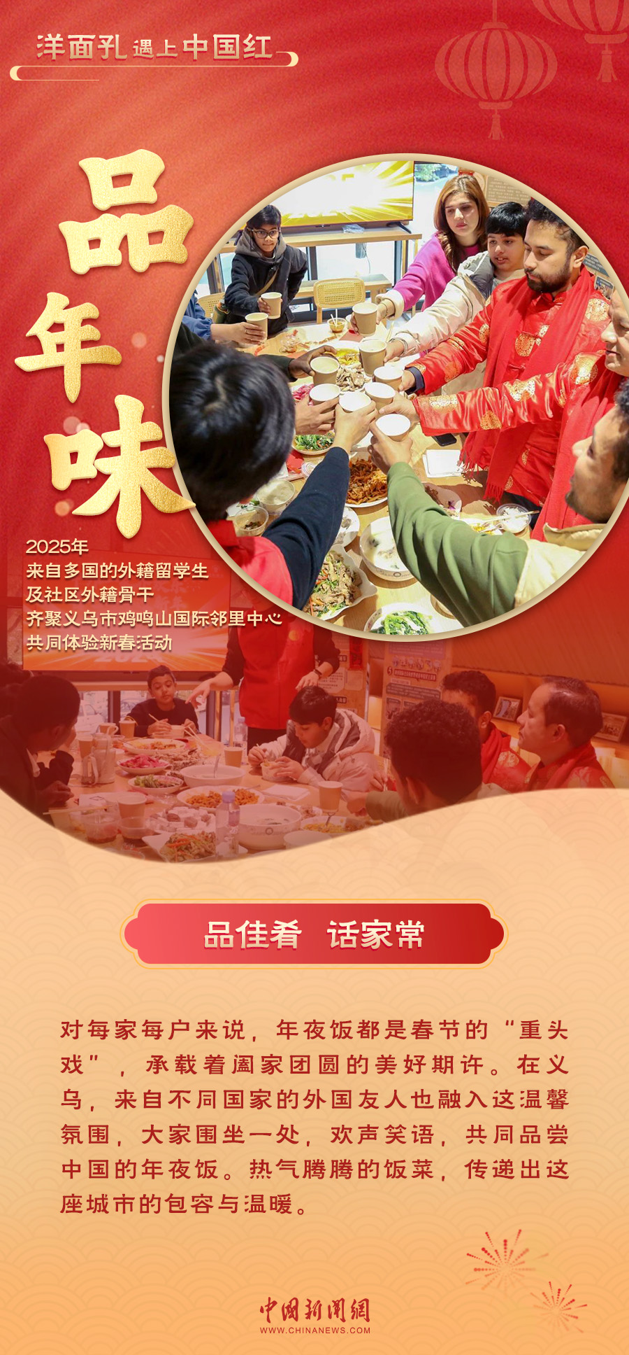 當“洋面孔”遇上“中國紅”,一場跨越文化的交融在義烏上演。紅火的對聯(lián)、熱鬧的戲劇表演、香甜的年夜飯……外國友人們沉浸在中國年的喜慶氛圍中,感受著這份獨特的溫暖與歡樂。義烏的年味,不僅溫暖了“世界老鄉(xiāng)”的心,也讓全球各個地方看到了中國年的魅力與溫度。