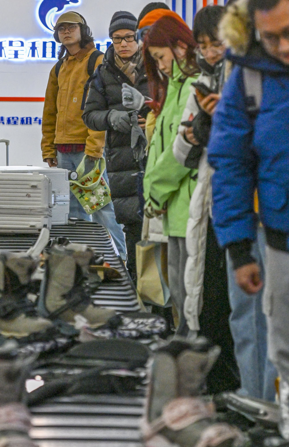 1月25日,在阿勒泰雪都機(jī)場行李提取大廳,游客等待提取行李。