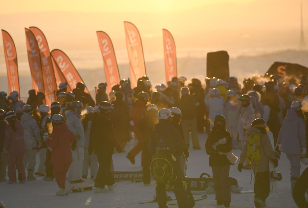 日落時(shí)分,阿勒泰市將軍山國際滑雪度假區(qū)的山頂區(qū)域人頭攢動(dòng)(1月24日攝)。