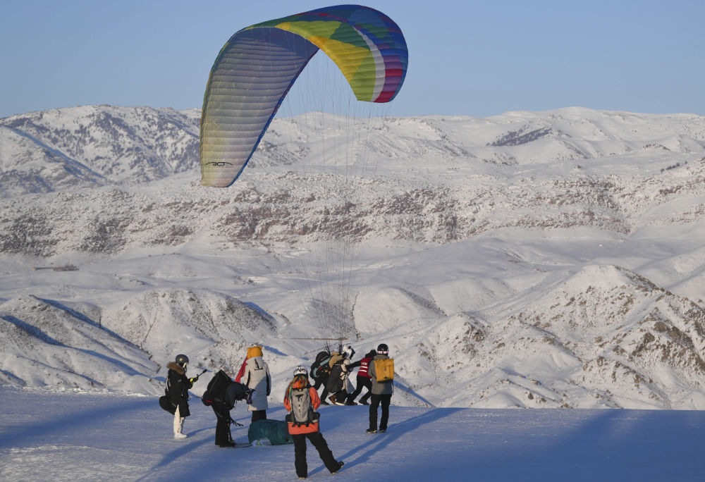 1月24日,游客在將軍山國際滑雪度假區(qū)體驗(yàn)滑翔傘。