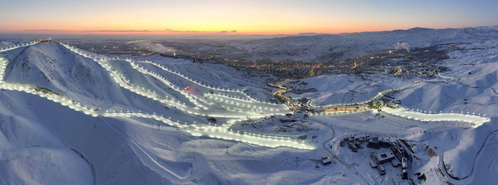 黃昏時(shí)分的將軍山國際滑雪度假區(qū)(1月24日攝,無人機(jī)照片)。將軍山國際滑雪度假區(qū)在夜間開放多條雪道,以滿足“雪友”多樣化需求。