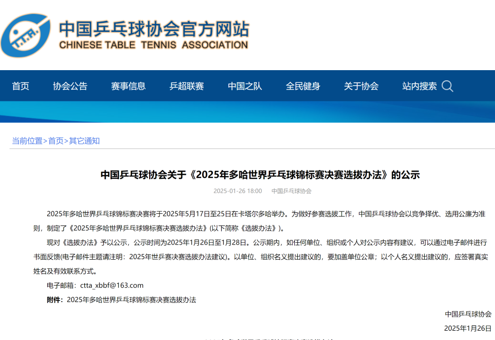 中國(guó)乒協(xié)26日在官網(wǎng)公示了《2025年多哈世界乒乓球錦標(biāo)賽決賽選拔辦法》(以下簡(jiǎn)稱《選拔辦法》)。