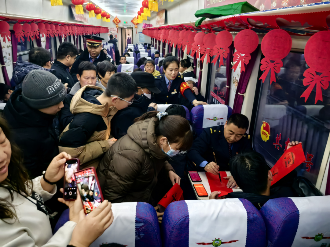 在從隴西開往青林的7504/7503次列車上開展的“新春送?!被顒樱F(xiàn)場書寫福字與春聯(lián),把誠摯美好的新春祝福融入其中。