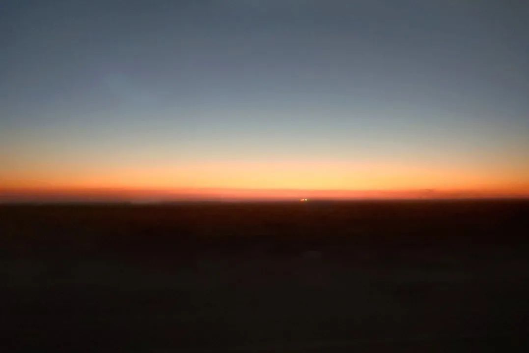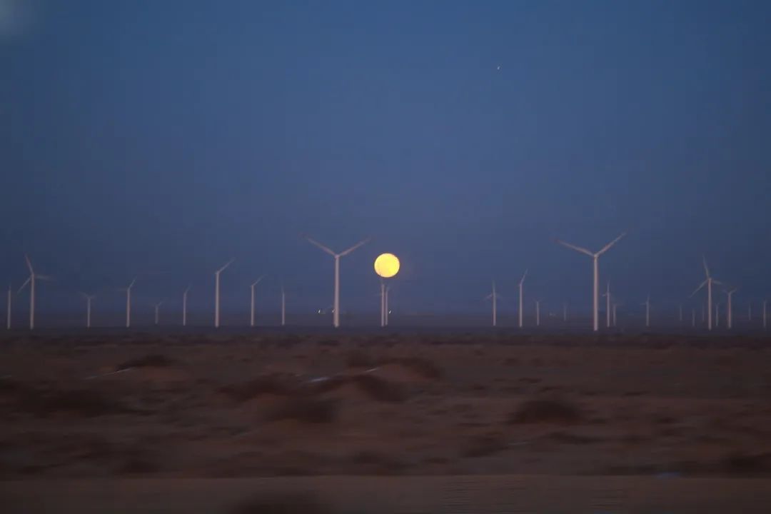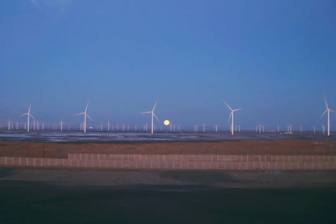 在前往家鄉(xiāng)的列車上經(jīng)過哈密時,我坐在窗邊正吃著泡面,抬頭便看到這絕美月色,我用相機將它定格,而在車廂的另一邊是落日,兩種景色交匯在此,也應了窗貼上這句“回家的路,就是最美的風景”。