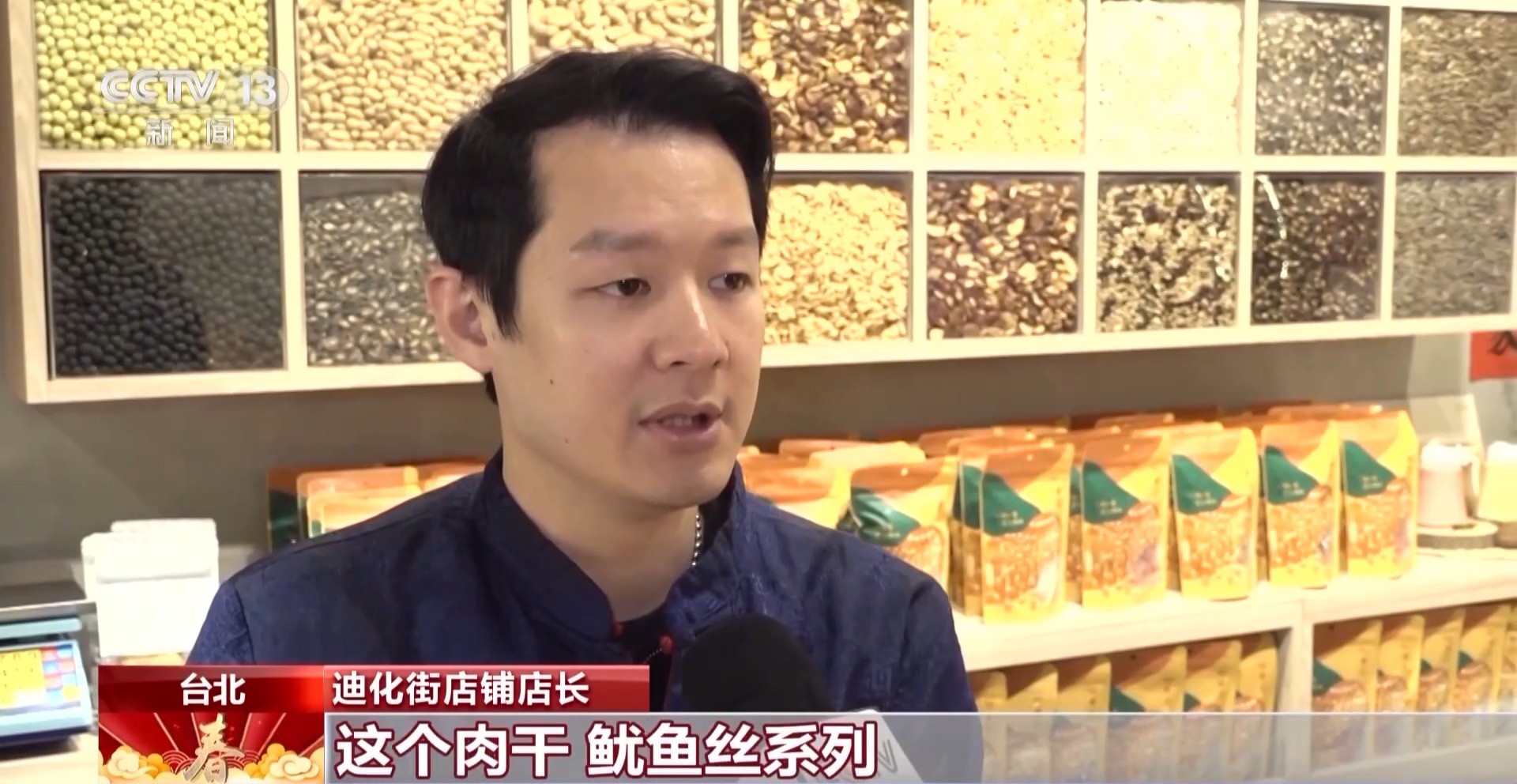 迪化街店鋪店長(zhǎng):春節(jié)期間大部分人家會(huì)選擇這個(gè)肉干、魷魚(yú)絲系列,還有我們擺放漂亮的糖果系列為主要的采購(gòu)商品。