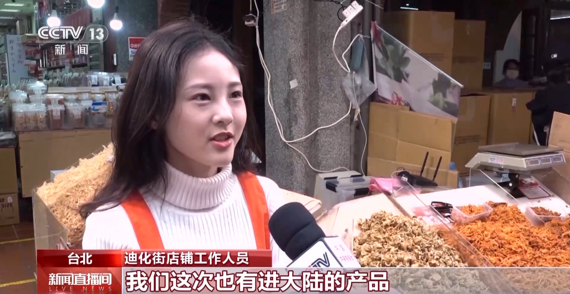 迪化街店鋪工作人員:我們這次也有進(jìn)大陸的產(chǎn)品,是小黃魚(yú)酥跟白帶魚(yú)酥,但是白帶魚(yú)酥因?yàn)檎娴馁u(mài)得太好了,所以我們前幾天就已經(jīng)斷貨了。