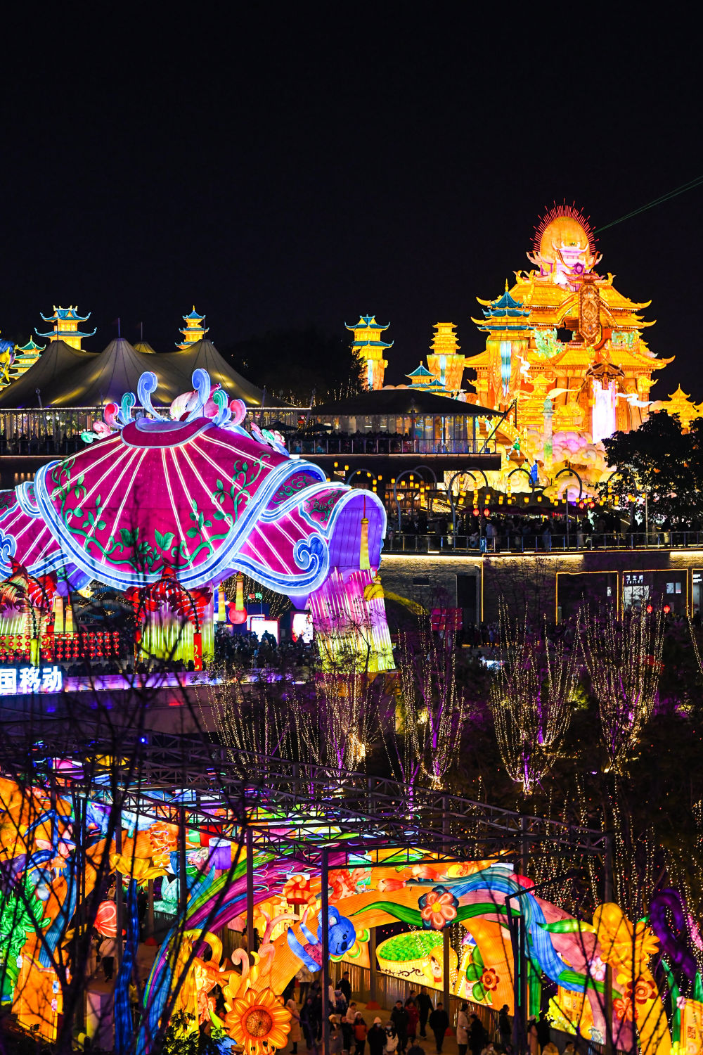邱玥設(shè)計(jì)的燈組《一路繁花》位于第31屆自貢國際恐龍燈會(huì)西大門入口(1月27日攝)。