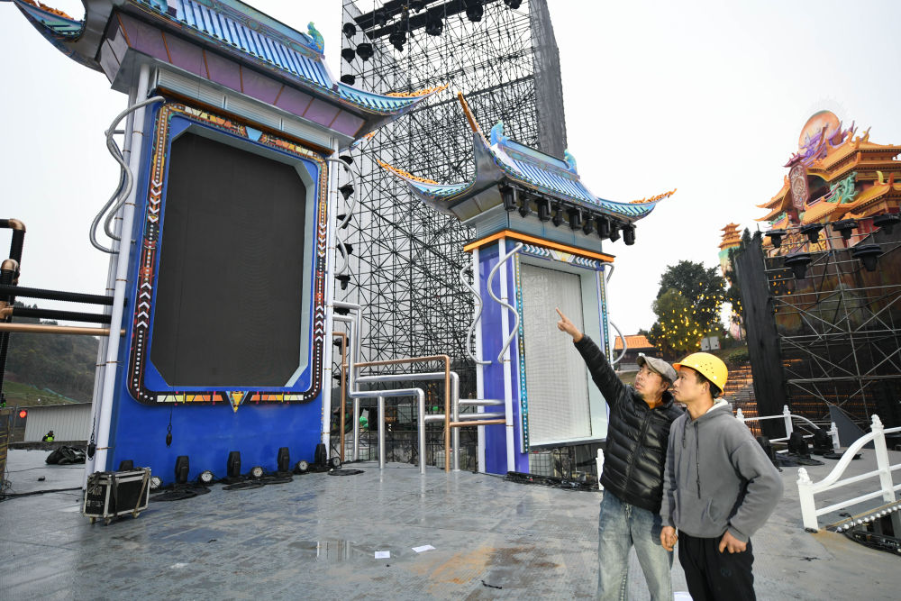 在第31屆自貢國際恐龍燈會(huì)主舞臺現(xiàn)場,萬松濤(左)與工作人員商討細(xì)節(jié),確保最終的呈現(xiàn)效果(1月14日攝)。