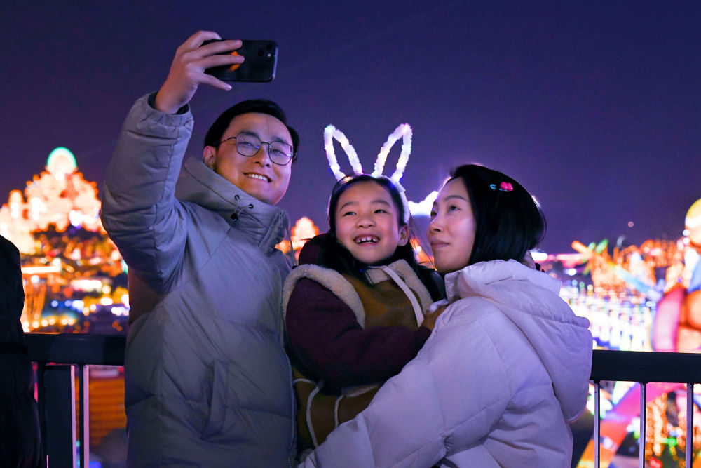 一家三代在第31屆自貢國際恐龍燈會(huì)試展上觀燈留影(1月14日攝)。