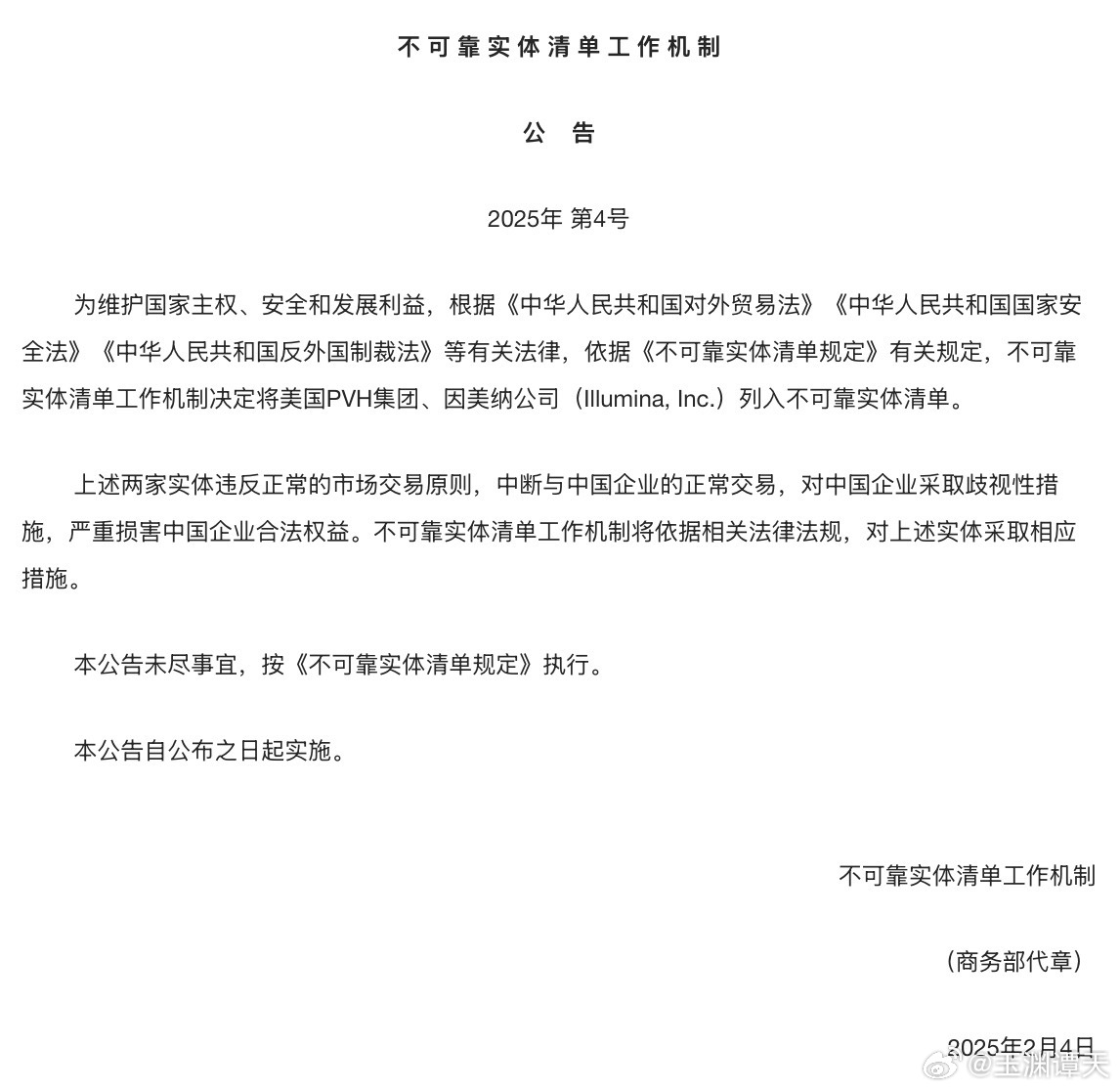 為維護(hù)國(guó)家主權(quán)、安全和發(fā)展利益,根據(jù)《中華人民共和國(guó)對(duì)外貿(mào)易法》《中華人民共和國(guó)國(guó)家安全法》《中華人民共和國(guó)反外國(guó)制裁法》等有關(guān)法律,依據(jù)《不可靠實(shí)體清單規(guī)定》有關(guān)規(guī)定,不可靠實(shí)體清單工作機(jī)制決定將美國(guó)PVH集團(tuán)、因美納公司(Illumina, Inc.)列入不可靠實(shí)體清單。