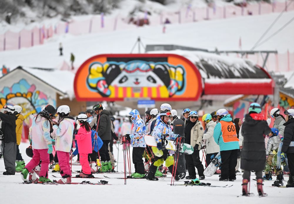 春節(jié)假期,眾多游客來到四川省阿壩藏族羌族自治州汶川縣羌人谷滑雪場(chǎng)游玩,在冰天雪地中歡度蛇年新春。