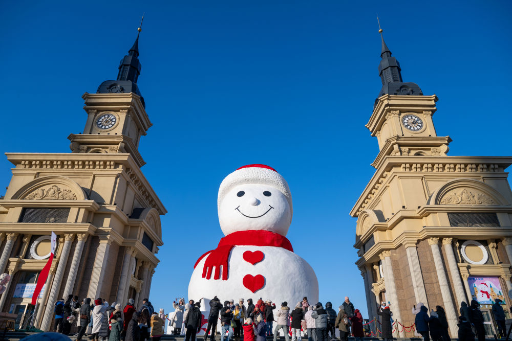 哈爾濱街頭巷尾張燈結(jié)彩,在百年老街中央大街,火紅燈籠高高掛,造型各異的錦鯉花燈栩栩如生;吉祥物“濱濱”“妮妮”向游人問好;在太陽島雪博會,扎著紅圍巾、身貼福字的“雪韻福娃”喜氣洋洋。