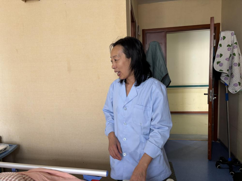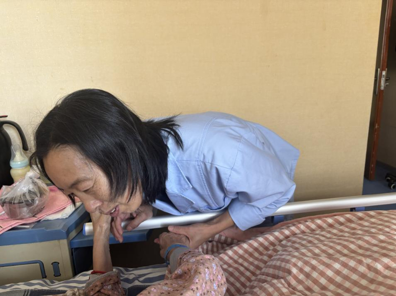 來(lái)自黑龍江省的李世娟,今年55歲,因?yàn)槟昙o(jì)原因本想從事育兒嫂工作的她只能從事護(hù)理工作?!凹艺菊f(shuō)雇主更想要年輕些的阿姨帶孩子。”輾轉(zhuǎn)之下,她考取了護(hù)工資格證,成為一名老年護(hù)理員?!斑@是我照顧的第二位老人”她輕聲說(shuō)。第一位老人出院時(shí),家屬本想帶她走,她婉拒了,“看著他們好起來(lái)我也高興,但這里總有更需要我的人?!闭勗掗g,90床奶奶的兒子來(lái)探望老母親,輕摸著奶奶的頭一遍又一遍地問(wèn)著“睜眼看看,我是誰(shuí)呀”,奶奶也是含糊不清地說(shuō)著“不知道”,兒子半開(kāi)玩笑地說(shuō)“傻老太太”。李世娟在一旁緊忙說(shuō):“你不要說(shuō)她傻啊,糊涂啊,因?yàn)榛加邪柶澓DY的人有時(shí)是清醒的,一聽(tīng)你說(shuō)她傻她就覺(jué)得自己好像是傻了”,李世娟向記者說(shuō),自己平日很喜歡看健康教育節(jié)目,見(jiàn)到認(rèn)識(shí)的人也會(huì)多科普幾句,“我姑娘說(shuō),媽你別老給人家上課,我說(shuō)媽那不是上課,只是想把自己知道的分享給人家”,李世娟一邊說(shuō),一邊難掩苦笑。