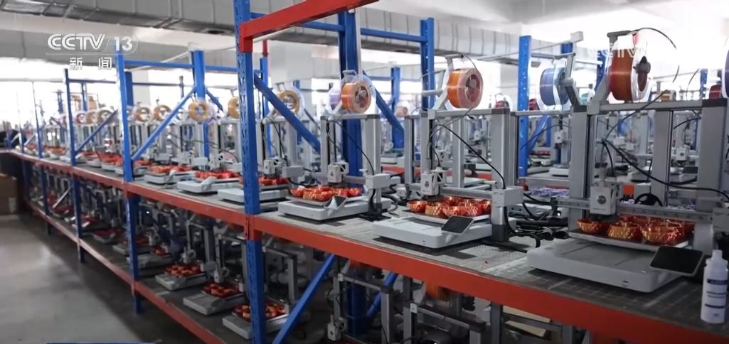 工廠負責(zé)人告訴記者,他的產(chǎn)品幾乎一直在海外電商平臺排名第一,秘訣之一就是打印的原材料。為了研發(fā)這個三色的材料,團隊花了近四個月的時間。但也讓產(chǎn)品獲得了獨特優(yōu)勢。在打印車間的樓上就是占地面積5200平米的耗材車間,近50臺機器同時開動,全力生產(chǎn)。