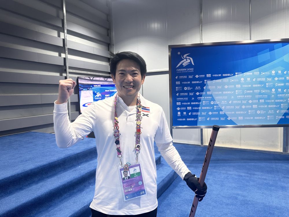 泰國冰壺男隊隊長蓬塞·馬哈塔納薩昆在展示他的徽章。新華社記者 戴錦镕 攝