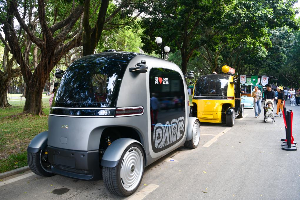 這是2024年11月11日在深圳蓮花山公園拍攝的無(wú)人駕駛觀(guān)光車(chē)、零售車(chē)。新華社記者 梁旭 攝