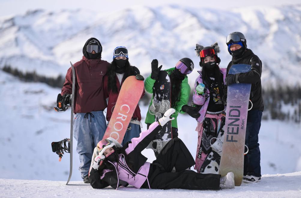 1月28日,來自浙江的“95后”姑娘張琦彬(前)與一起滑雪過年的同伴們在新疆阿勒泰將軍山國際滑雪度假區(qū)合影。新華社記者 胡虎虎 攝