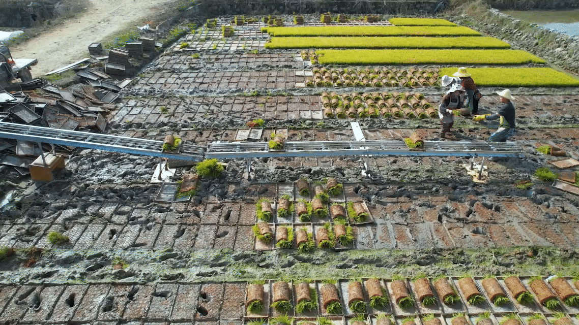 2025年2月13日,云南省西雙版納傣族自治州勐海縣,農(nóng)民把傳輸帶上的秧苗搬運(yùn)到車上。(新華社記者 王賢思攝)