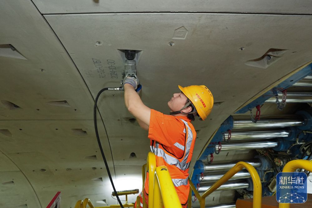 2月25日,中鐵十四局技術(shù)人員在甬舟鐵路金塘海底隧道“甬舟號(hào)”盾構(gòu)機(jī)內(nèi)測(cè)量管片拼裝作業(yè)情況。