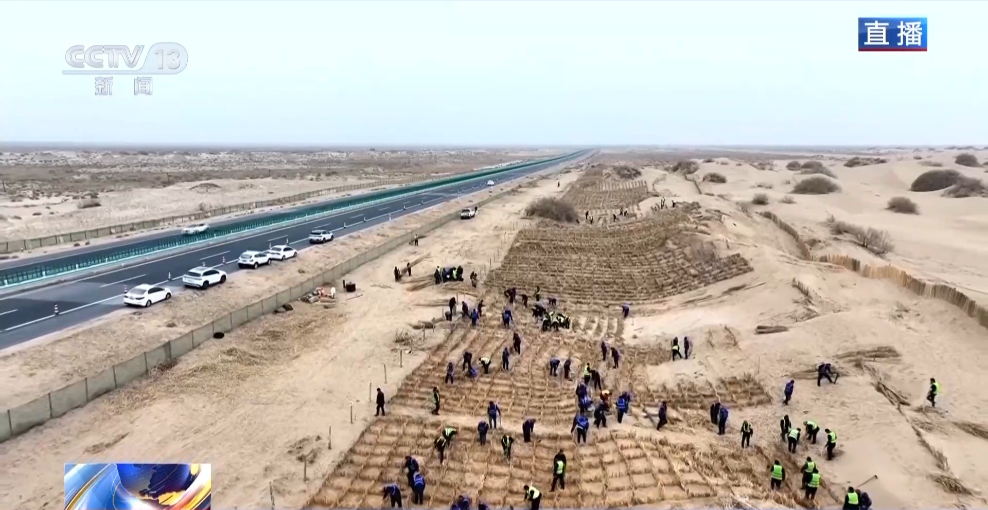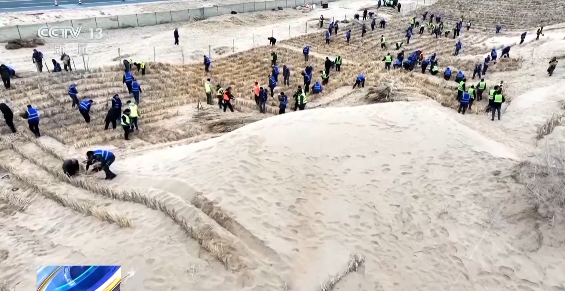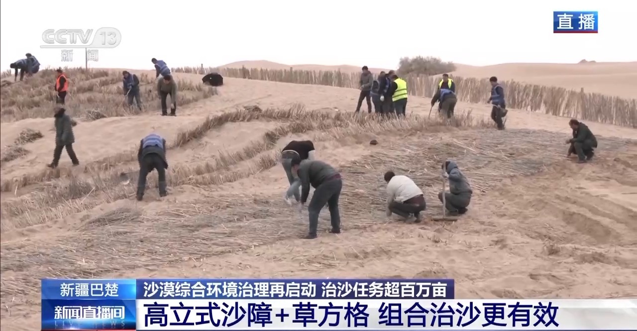 總臺(tái)記者從新疆巴楚縣阿克薩克馬熱勒鄉(xiāng)防沙治沙工程施工現(xiàn)場(chǎng)發(fā)回報(bào)道。當(dāng)?shù)氐?00多名各族干部群眾人工鋪設(shè)“草方格”,也就是將干蘆葦鋪設(shè)在地面,再壓進(jìn)沙土中,它的主要作用是固沙。