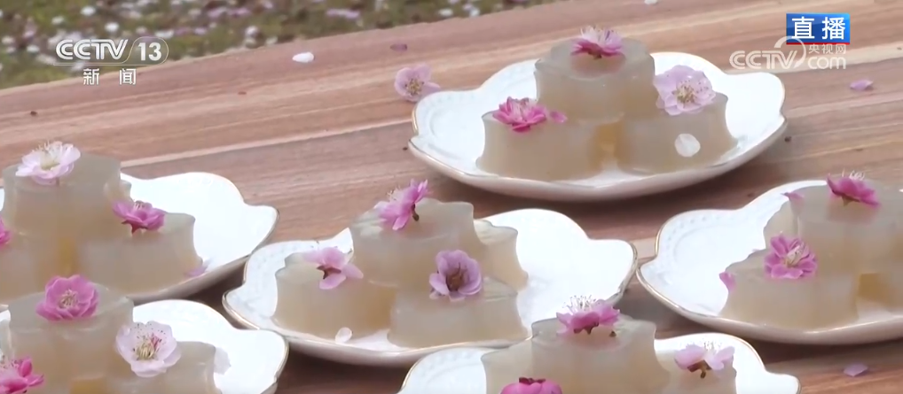 這個季節(jié)來到芳院村,與賞花踏青最搭配的就是圍爐煮茶了。芳院村的茶也非常特別,叫做“蛋茶”。就把煮開的茶水沖入均勻攪拌的蛋液中,然后再加上冰糖,這就是“蛋茶”。每當(dāng)村里誰家辦大事、干重活的時候,村民們都會泡蛋茶來接待,這也是當(dāng)?shù)氐拇褪锥Y。在芳院村,這個季節(jié)還有一個春日限定美食,就是梅花糕。它主要的原材料是當(dāng)?shù)氐牡毓戏郏P(guān)鍵在于用了梅花花瓣熬出來的汁。梅花糕不僅形似梅花,而且入口甜糯、味道清雅,這些也是芳院村正在打造的“花樣”經(jīng)濟(jì)。近年來,當(dāng)?shù)卦诒Wo(hù)傳統(tǒng)村落的基礎(chǔ)上,以花為“媒”培育“花樣”經(jīng)濟(jì),吸引游客前來賞花打卡,帶動村集體和村民雙增收。